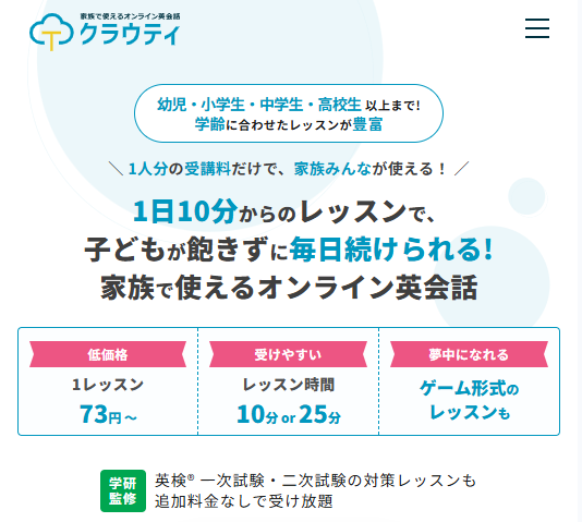さらに、クラウティでは教育大手である学研グループ監修の教材を採用しています。小学生向け英会話から英検対策、日常英会話、ビジネス英語まで幅広いカリキュラムが用意されており、初心者から経験者までレベルに合わせて学習を進めることが可能です。()