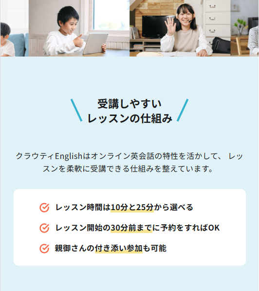 オンライン英会話でありがちな「ZoomやSkype設定が難しい」といった問題もありません。クラウティは専用システム上でレッスンが完結するため、アプリのダウンロード不要でスムーズに受講できます。小さなお子さまでも操作しやすく、保護者が管理しやすい設計になっています。()