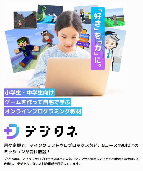 デジタネ最大の特徴は、子どもが大好きなゲームの世界を使って学べる点です。マインクラフトやRobloxなど人気ゲームを教材として活用し、「遊びながら学ぶ」スタイルを採用。プログラミング初心者でも自然にコードの考え方や論理的思考力を身につけられるよう設計されています。