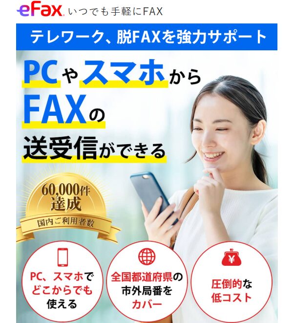 **eFax(イーファックス)**は、インターネット環境があればどこからでもFAX送受信が可能なクラウド型サービスです。まずは公式サイトでプラン内容や対応機能をチェックして、自分に合ったFAX活用方法を見つけてみてください。