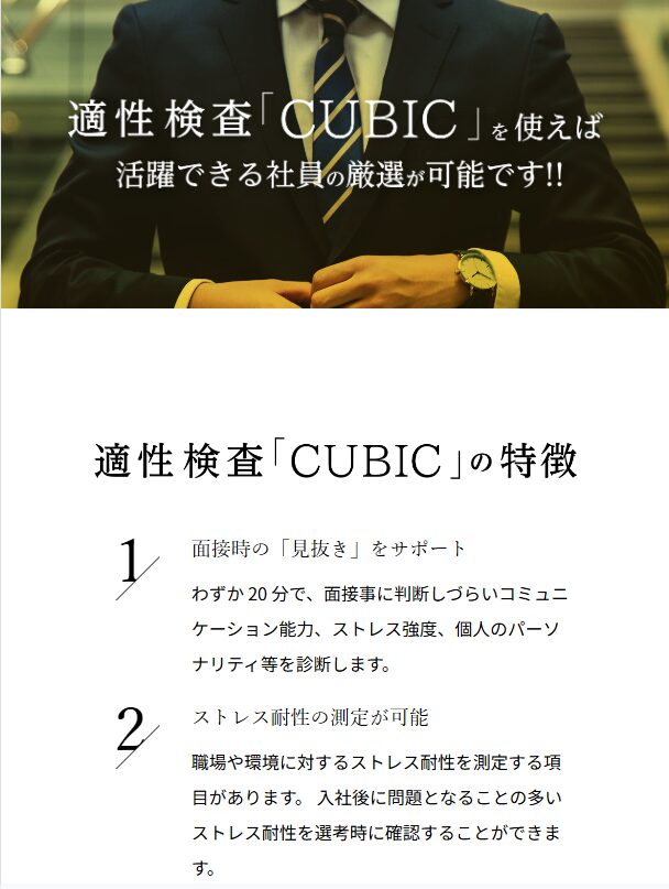 CUBICの大きな特徴は、短時間で応募者の性格や能力を多面的に分析できる点です。およそ20〜30分程度の検査で、仕事への適性や性格傾向などを客観的なデータとして確認できるため、面接だけでは見えにくい特性を把握することができます。