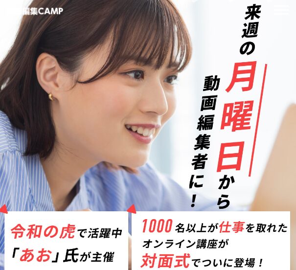 動画編集CAMPは、短期集中で動画編集スキルを学べる実践型スクールです。公式サイトで講座内容や開催情報をチェックして、動画編集スキルを身につけてみてください。