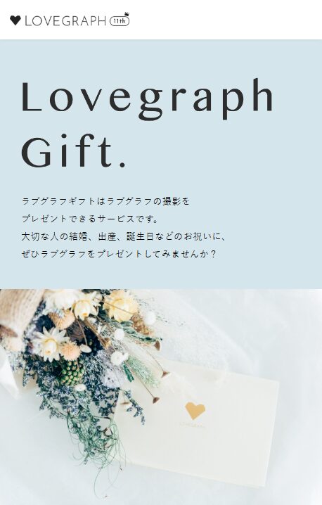**Lovegraph(ラブグラフ)**は、出張撮影体験をギフトとして贈れるフォトサービスです。公式サイトでプランやギフト内容をチェックして、大切な人に特別な思い出をプレゼントしてみてください。