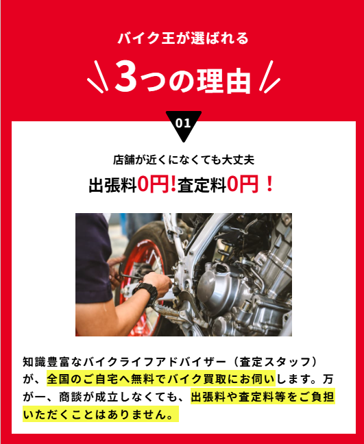 バイク王の大きな特徴は、無料の出張買取サービスです。全国どこでも査定スタッフが自宅まで来てくれるため、店舗へ持ち込む手間なく売却できます。査定料や出張費はかからず、気軽に利用できる点も魅力です。