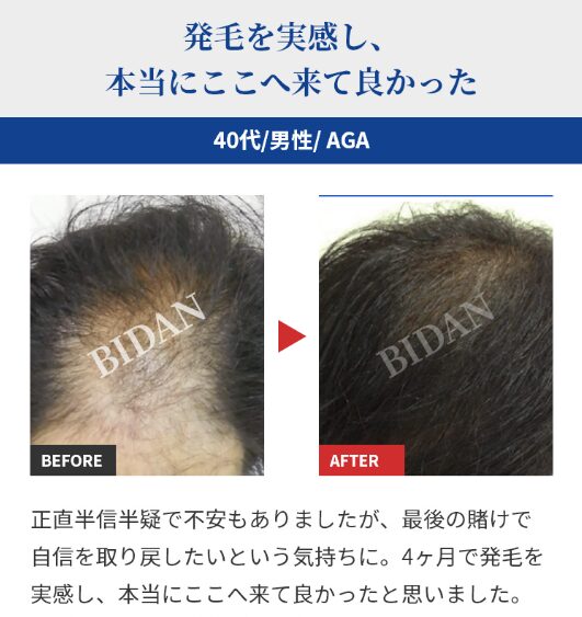 BIDANの大きな特徴は、“育毛ではなく発毛”を目指す点です。髪を太くするだけでなく、実際に髪が生える状態へ導くことを重視しており、目に見える変化を実感できる施術が提供されています。