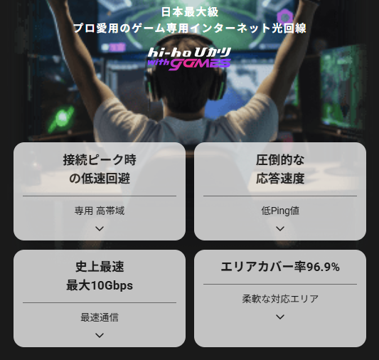 hi-hoひかり with gamesは、ゲームに特化した高速・低遅延の光回線サービスです。まずは公式サイトで料金や対応エリアをチェックして、快適なゲーム環境を始めてみてください。