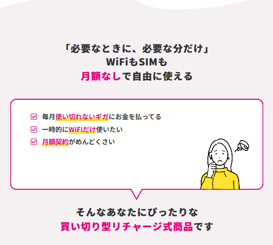 リチャージWiFiの最大の特徴は、契約不要・月額料金なしで使える点です。端末を購入すれば、あとは必要な分だけギガをチャージするだけで利用でき、固定費がかからないシンプルな仕組みになっています。