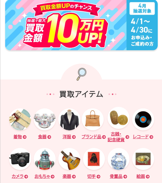 買取対象も幅広く、着物・ブランド品・貴金属・骨董品・食器など多ジャンルに対応。まとめて査定に出せるため、引っ越しや遺品整理にも便利です。