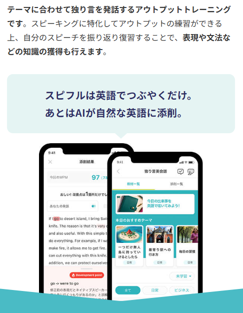 などを自動でチェックしてくれるため、独学でも正しい英語を身につけられる仕組みになっています。