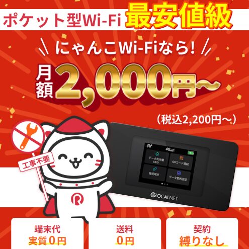 にゃんこWiFiの最大の特徴は、月額2,200円〜という低価格で利用できる点です。ポケットWiFiの中でも比較的安く、コストを抑えながらネット環境を整えたい方に適しています。