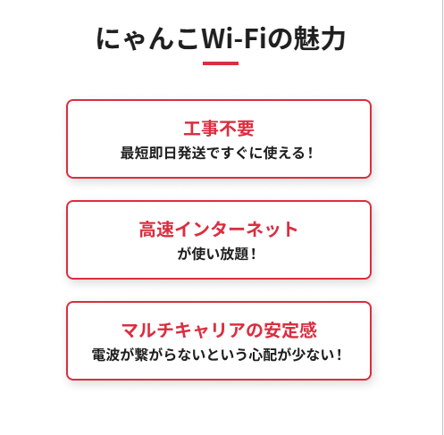 さらに、工事不要で届いたその日から使える手軽さも大きな魅力です。光回線のような開通工事が必要なく、すぐにインターネットを利用できます。